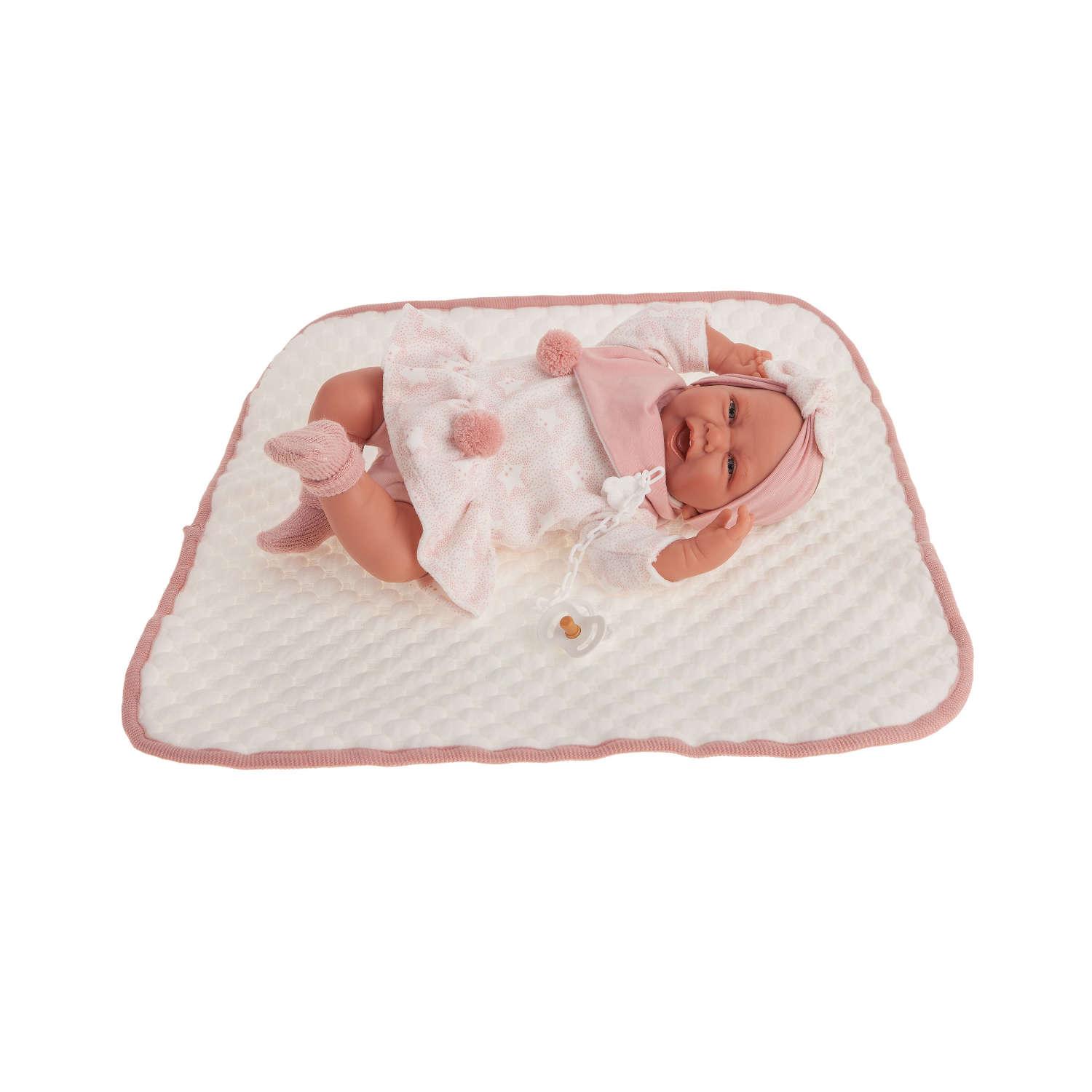 questa adorabile bambola è avvolta in una bellissima copertina rosa antico in cotone biologico imbottita di morbido peluche. Clara indossa per loccasione una morbida tutina bianca con stampe di coniglietti e farfalline sui toni del rosa, un giacchettino in caldo cotone rosa antico imbottito e con il collo in peluche. Completa il tutto un cappello bianco abbinato alla tutina con un simpatico pon pon , una calda scarpetta in pile e il suo bellissimo ciuccio. Quando viene premuta sull’addome, la bambola inizia a emettere suoni simili al balbettio del bambino, la bambola ha un corpo in tessuto morbido, la testa e gli arti sono realizzati in vinile softtouch senza plastificanti nocivi. Clara è una bambola notevolmente realistica grazie ai suoi dettagli, come per esempio la bocca e le rughette del viso.