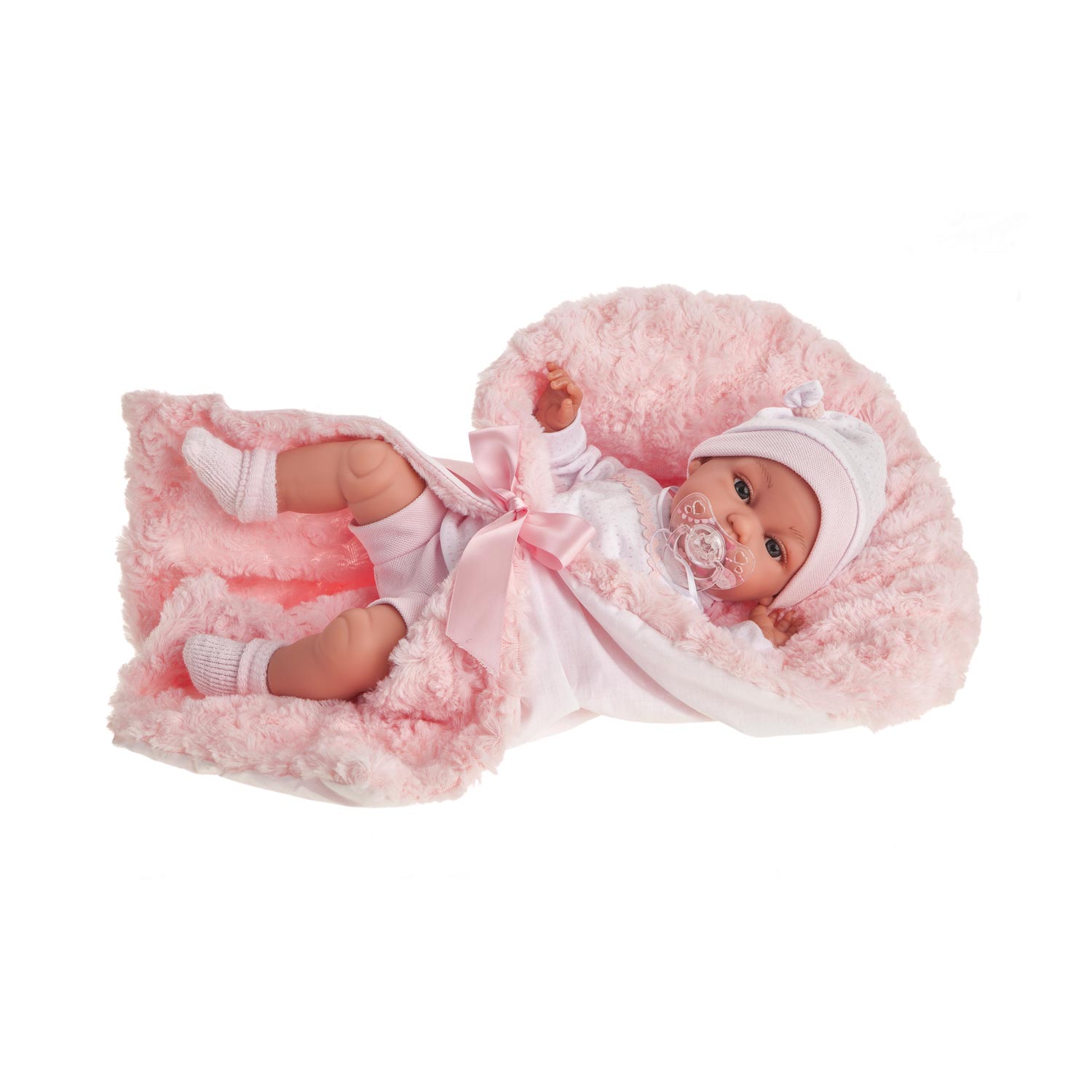La bambola Toneta Arullo di Antonio Juan è realizzata artigianalmente ed è curata nei particolari per regalare espressioni naturali e realistiche. Indossa un completino bianco e rosa. Premendo il pancino emette il dolce suono della risata. Allinterno della confezione è presente il ciuccio e una copertina rosa imbottita da annodare con il nastro di raso.