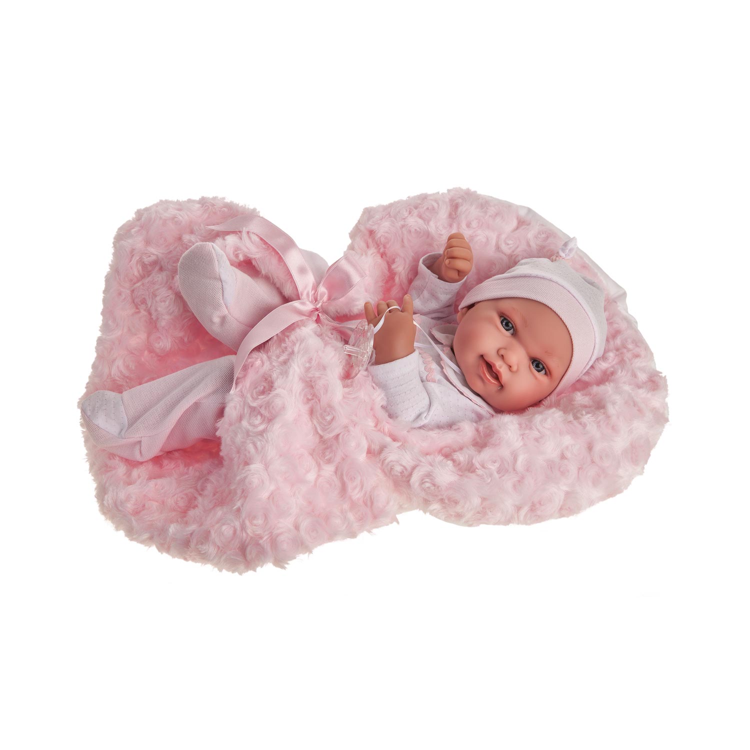 La bambola Pina Nina di Antonio Juan è realizzata artigianalmente e ha la pelle morbida e vellutata. Indossa una bellissima tutina sui toni del rosa e un cappellino coordinato. Allinterno della confezione è presente la soffice copertina di pelo della stessa tinta dellabitino.