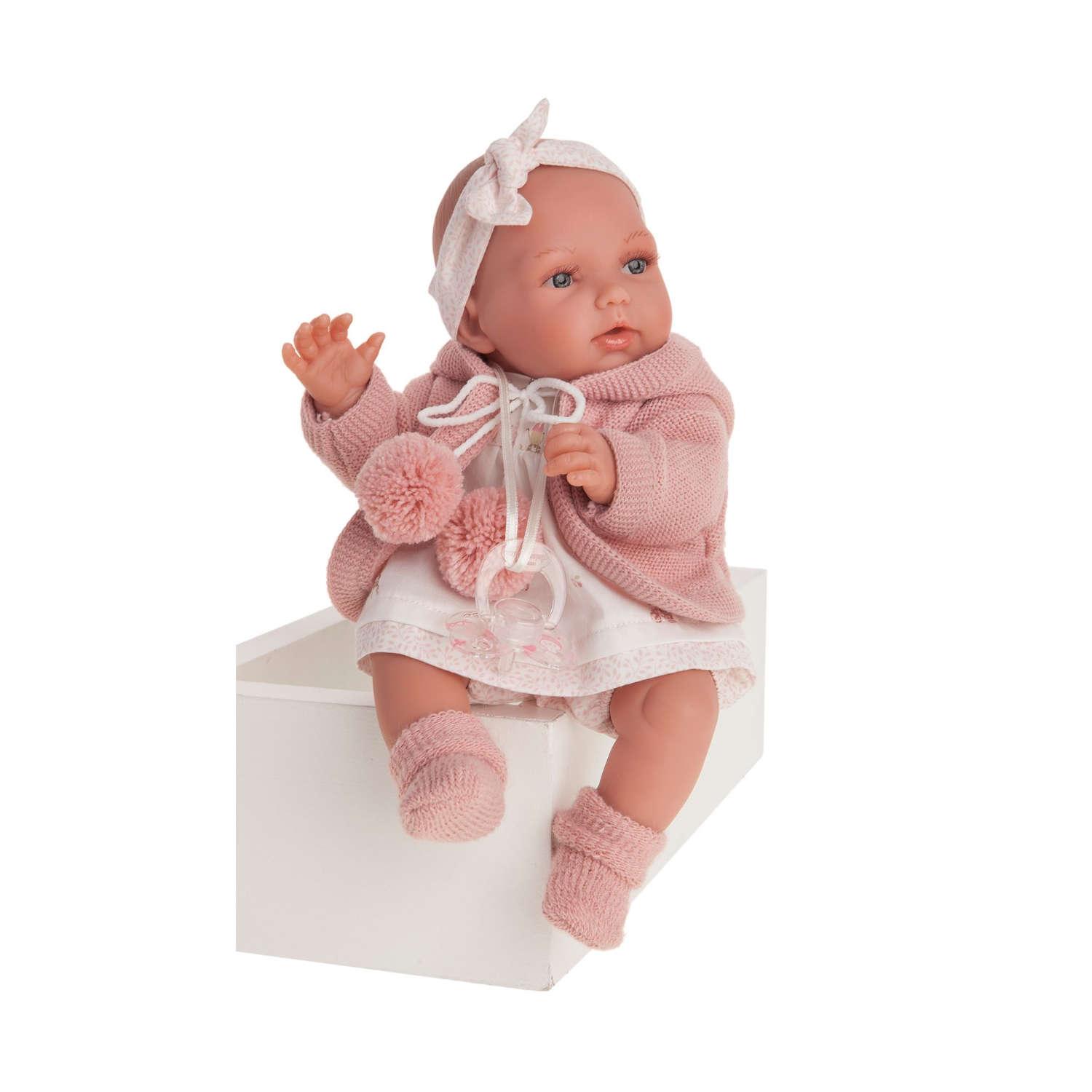 bellissima bambola con un corpo in tessuto e cuciture multiple, le braccia e le gambe iniziano rispettivamente dall’avambraccio e dalla coscia, questa modella non ha capelli, i suoi occhi sono sempre aperti e sono blu e ha il ciuccio, nel suo corpo in tessuto, nella zona del ventre, ha un meccanismo vocale che quando premuto, suona un balbettio