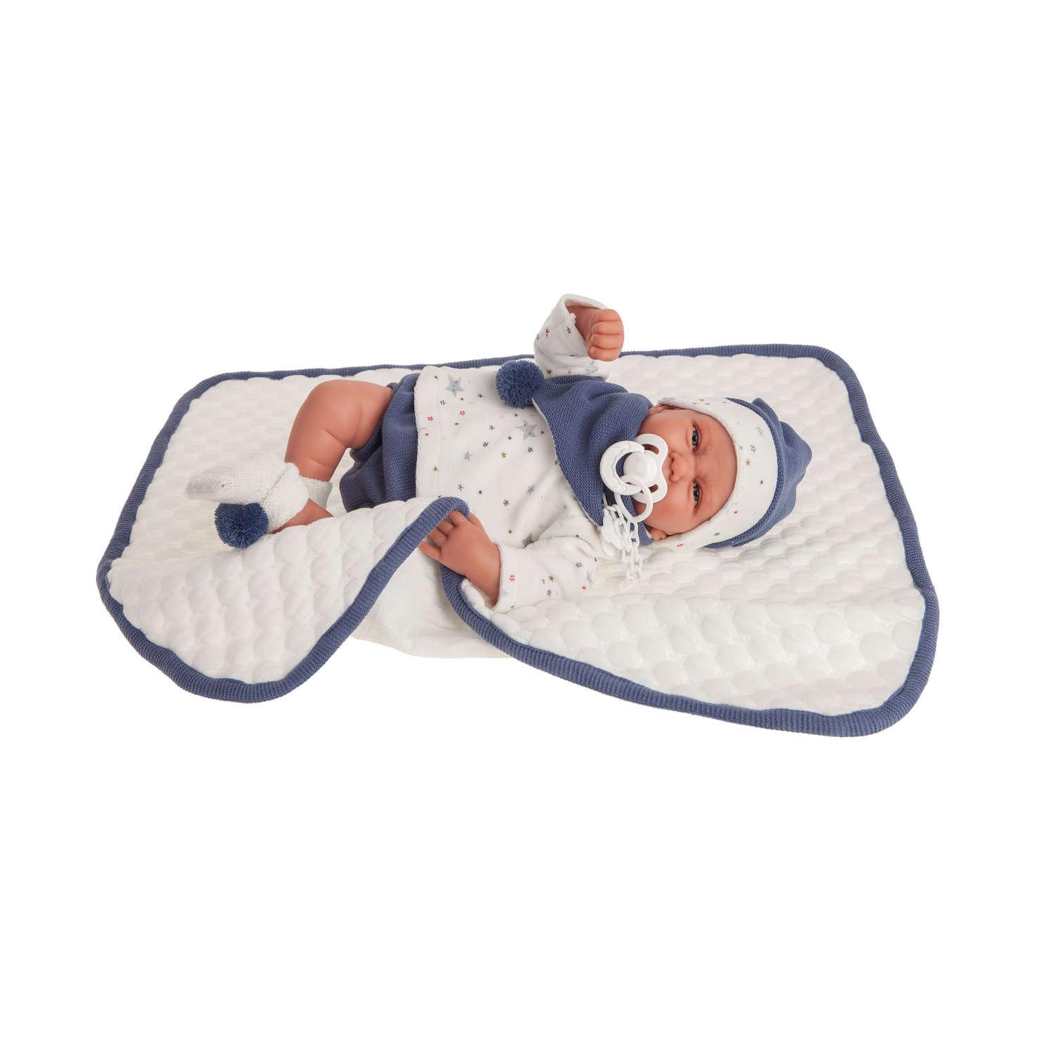Carlo è un adorabile Bebè dallespressione felice e sorridente , ha il corpo morbido ed è davvero realistico con tutti i dettagli ben definiti. E pronto per essere coccolato ed è vestito in modo elegante per un occasione indimenticabile. Indossa un comodo pantaloncino in filo color azzurro, una maglia stampata in ciniglia a maniche lunghe, una bandana con pom pom, un caldo cappellino in testa e soffici calzini tutto rigorosamente coordinato. Carlo è anche avvolto da una graziosa copertina trapuntata e porta con sé linseparabile ciuccio.