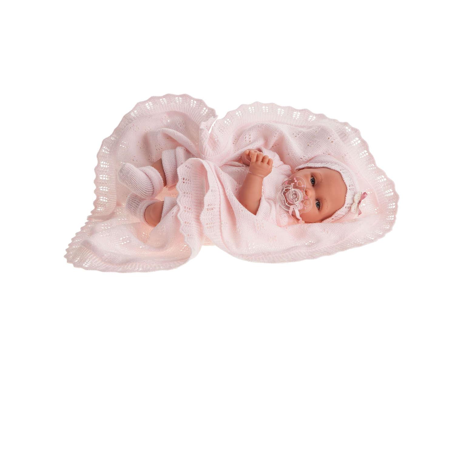 Questa bellissima bambola appartiene alle bambole Antonio Juan, ha uno scialle rosa, è alta circa 29 cm, ha un corpo in tessuto e può assumere varie pose. Questa bambola è senza peli, ha bellissimi occhi azzurri e include un ciuccio. Il suo corpo è in tessuto, morbido, con un meccanismo vocale.