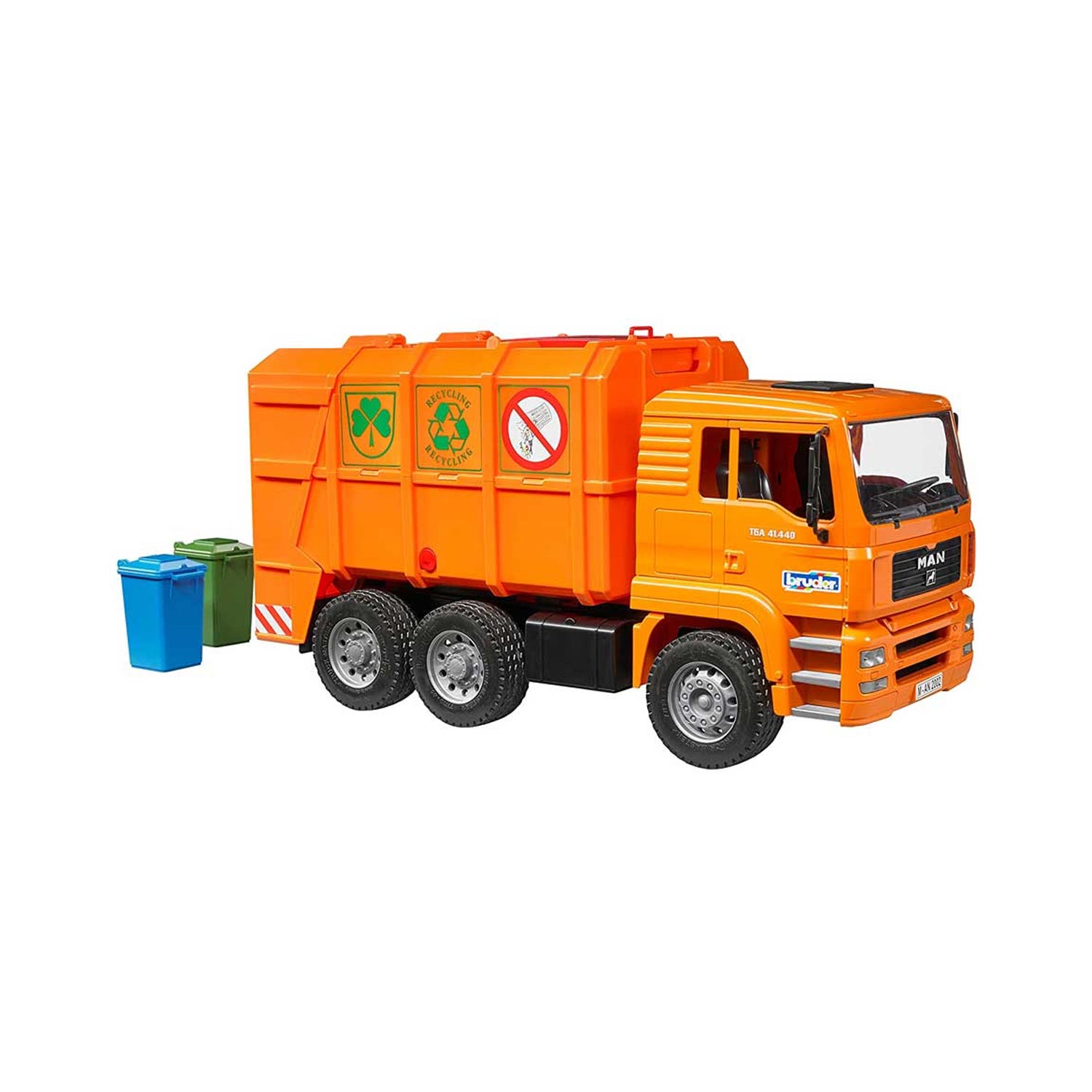 Il camion Scania Serie R di Bruder è il mezzo destinato al carico e scarico dei rifiuti tramite un meccanismo a ruota. É dotato di parabrezza in policarbonato infrangibile e portiere apribili. I bidoni vengono spinti nella mensola portante e mediante il sollevamento i rifiuti vengono scaricati nella tramoggia. Mentre la ruota gira, vengono introdotti nel meccanismo della pressa, compattati e convogliati nel silo. I due bidoni sono inclusi nella confezione.