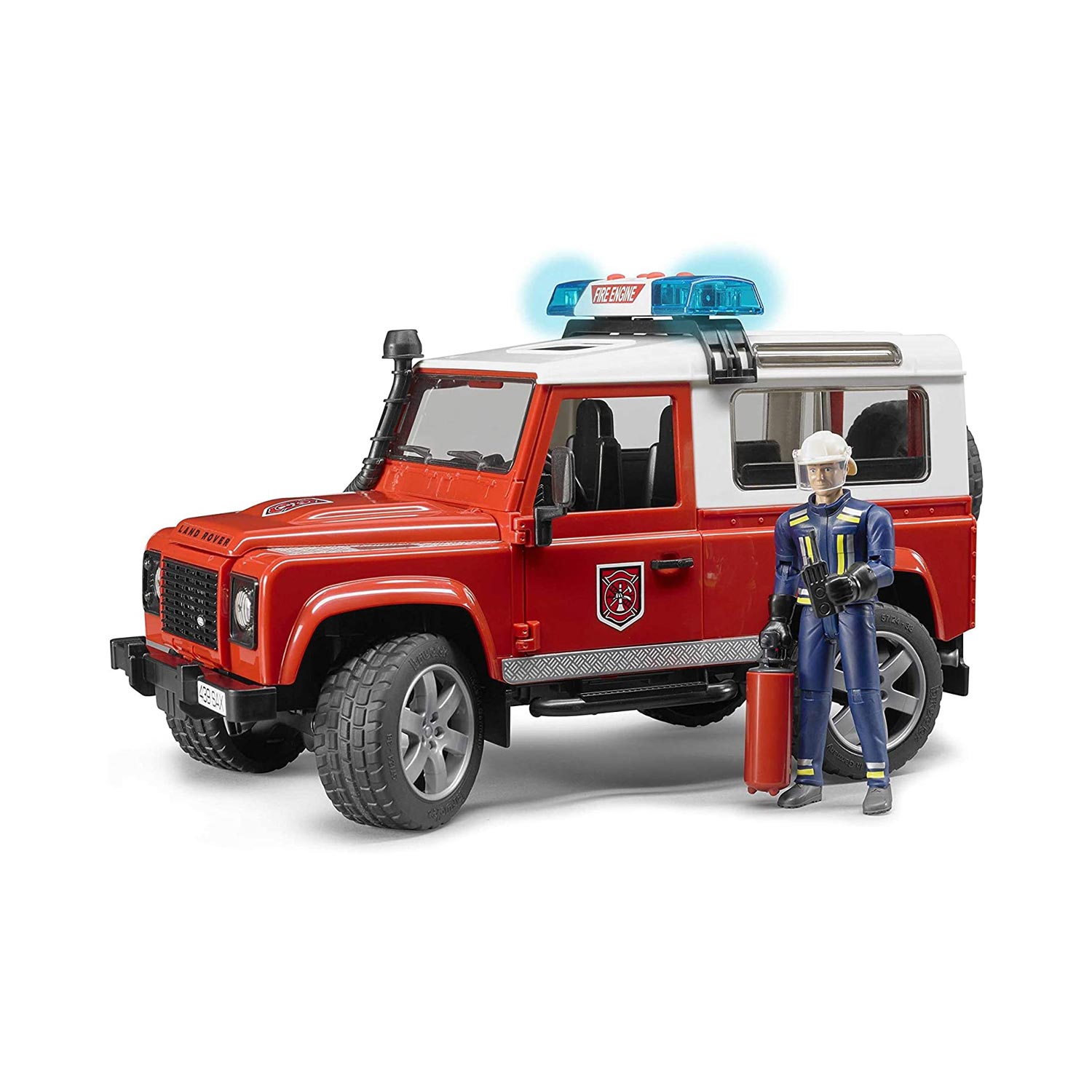 La Land Rover Defender station wagon di Bruder è il veicolo dei vigili del fuoco dotato di 2 porte laterali apribili, ruota di scorta fissata nel portellone apribile e sedile posteriore rimuovile. Allinterno della confezione, è presente il vigile del fuoco in uniforme con casco, guanti, apparecchio radio ed estintore. Il mezzo è dotato di luce e sound module universale.