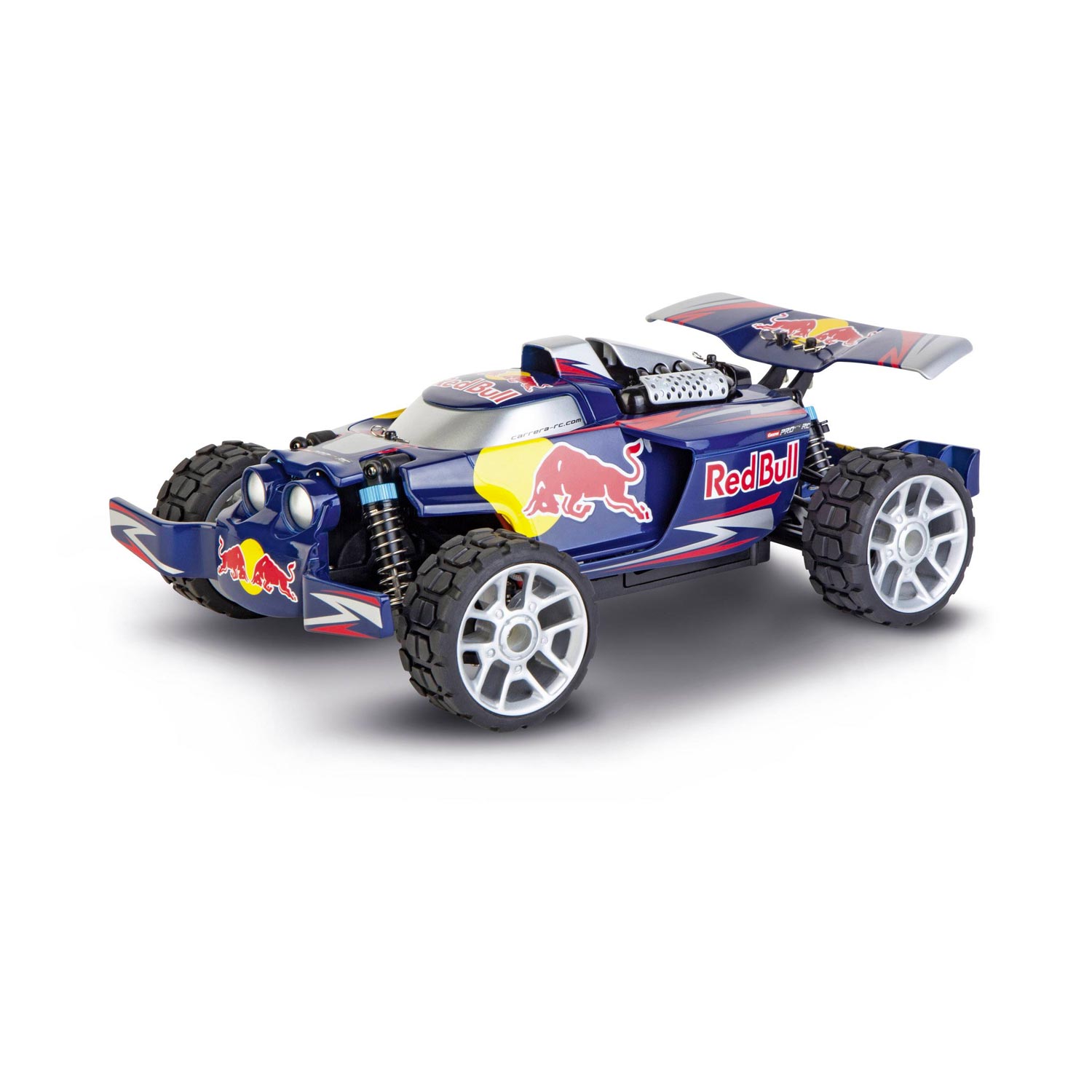 Carrera RedBull ha raffinati spoiler anteriori e posteriori e ha una velocità massima di 20km/h. Il telaio a sospensione completa e il cambio differenziale gestiscono tutti i dossi su una pista. I passeggino RC sono disponibili nella versione 2.4GHz digitale proporzionale e 2.4 GHz full function. Ciò consente di viaggiare con un massimo di 16 auto contemporaneamente senza alcun problema.
