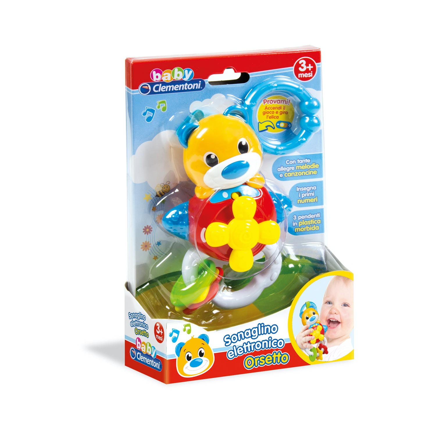 Il sonaglino di Clementoni è a forma di orsetto a bordo di un aereoplanino per far decollare il divertimento dei più piccoli. Girando lelica, lanimaletto insegna i primi numeri e canta allegre canzoncine. I 3 pendenti della pratica maniglia sono in morbida plastica, perfetti per la fase della dentizione. Grazie al comodo anello, il sonaglino è facile da appendere alla culla o al passeggino.