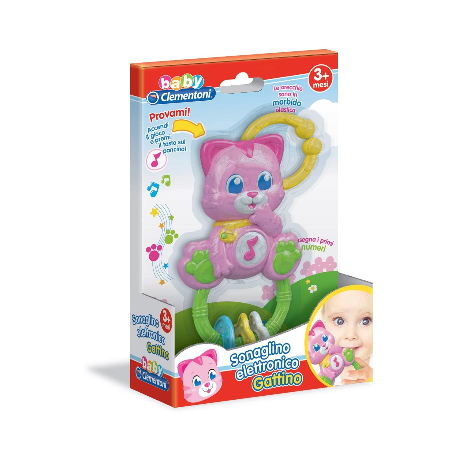 Il sonaglino Clementoni ha come protagonista una gattina che canta e insegna i primi numeri e tante nuove parole. Le orecchie sono realizzate in morbida plastica da mordicchiare per supportare la delicata fase della dentizione. Il pancino è un tasto luminoso interattivo. Grazie al pratico anello, il sonaglino può essere facilmente appeso alla culla o al passeggino.