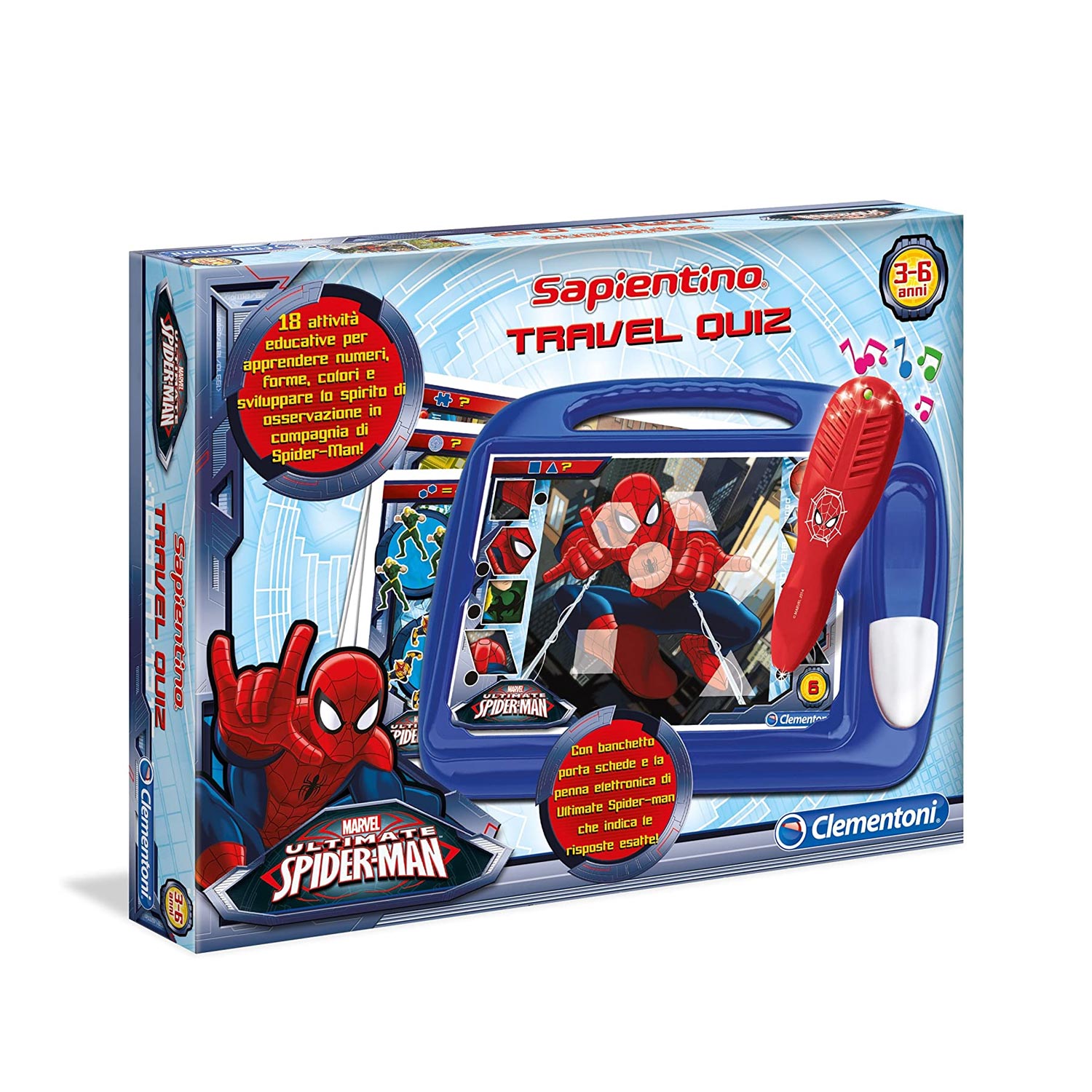Sapientino travel Spiderman di Clementoni è il gioco divertente e coinvolgente con oltre 180 quiz illustrati da risolvere con la penna elettronica. É presente un pratico banchetto in plastica e 9 schede con 18 attività educative per apprendere le nozioni tipiche delletà prescolare.