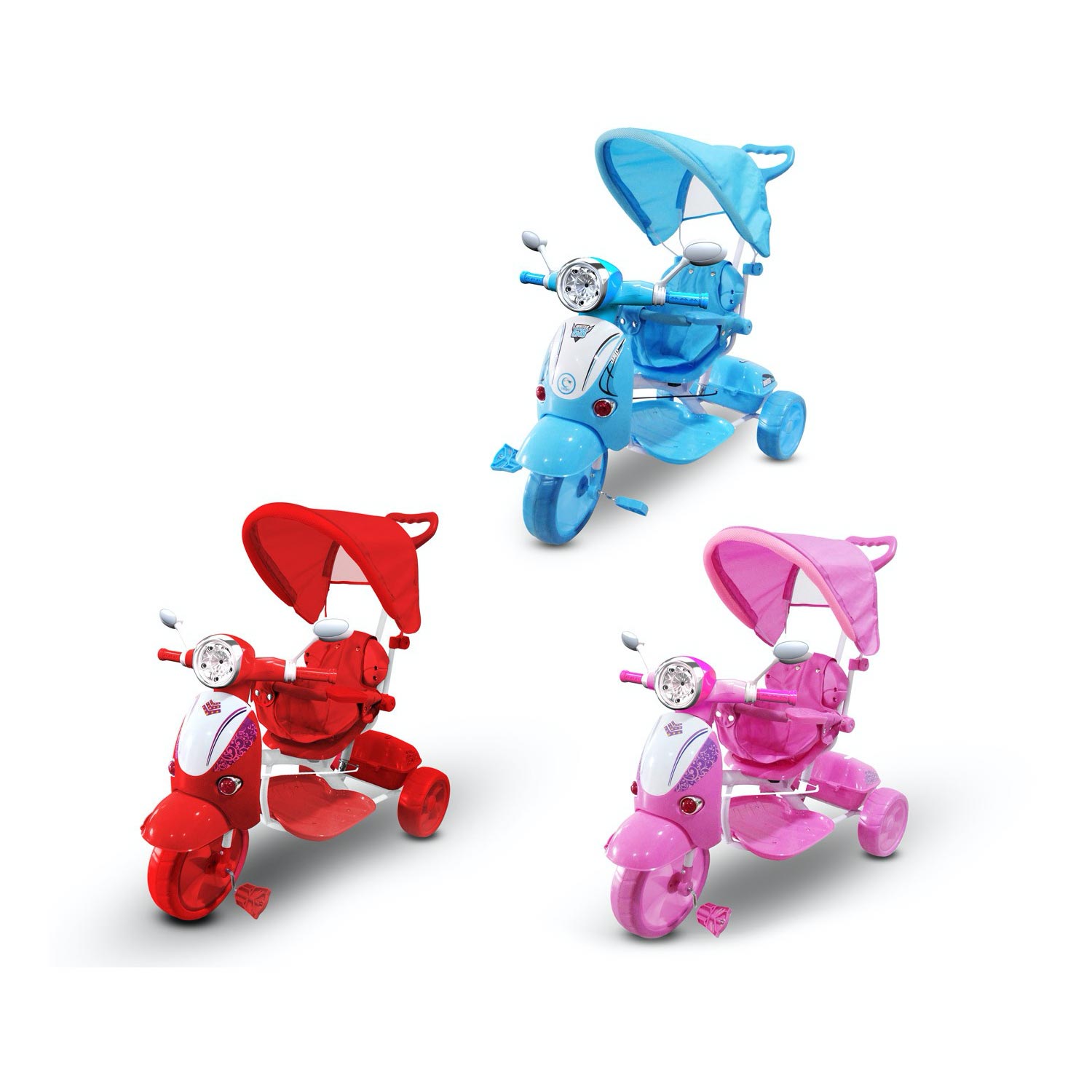 Il triciclo, disponibile in rosso, fuxia e azzurro, è dotato di pedali resistenti, una cappottina parasole e una seduta comoda circondata da protezioni. Le ruote sono robuste e ricoperte di gomma per garantire massima aderenza al suolo.