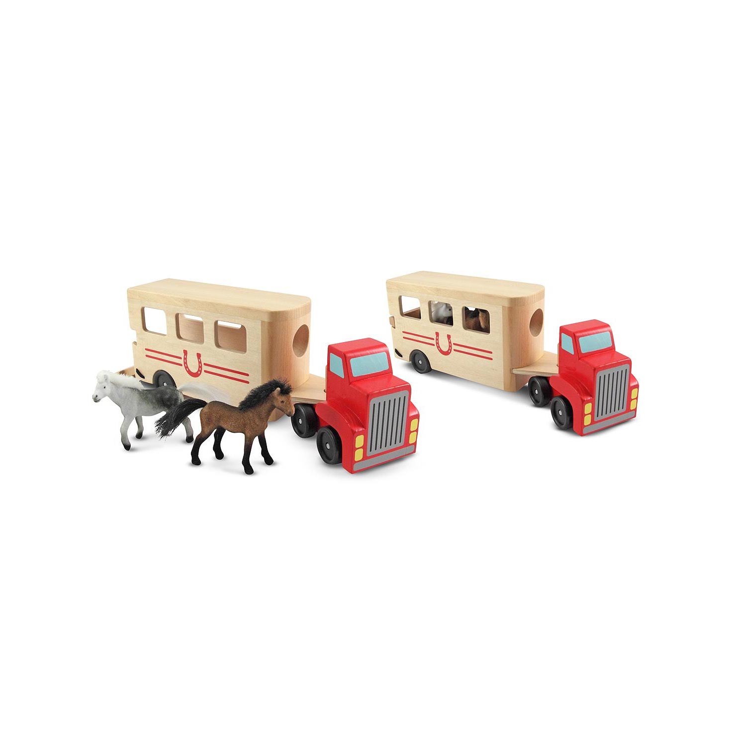 Il set in legno di Melissa & Doug è costituito da una macchina locomotrice rossa e un vagone con rampa mobile per aiutare la salita e la discesa dei 2 cavalli inclusi nella confezione. Particolarmente adatto per sviluppare le capacità motorie, il linguaggio e la finzione.