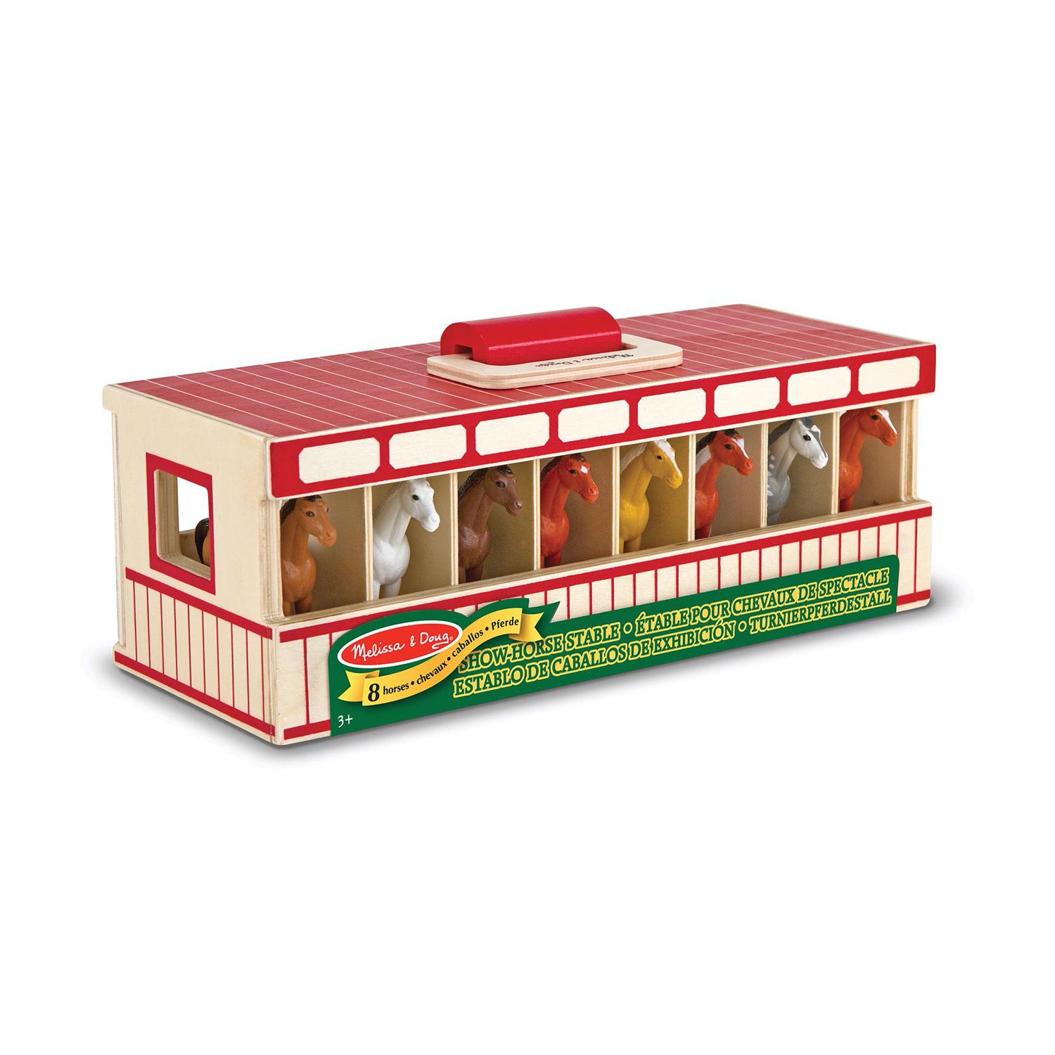 La scuderia portatile in legno di Melissa & Doug include 8 cavalli. Ogni box è dotato di etichette in cui poter scrivere il nome del cavallo. All’interno della scatola è presente una guida per distinguere le razze con le informazioni inerenti.