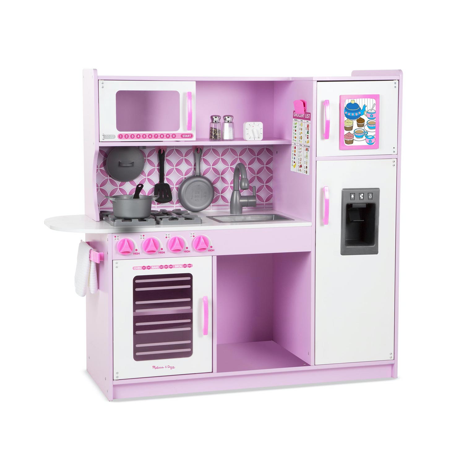 La cucina da giorno in legno rosa di Melissa and Doug è facile da assemblare e abbastanza spaziosa per permettere a diversi bambini di giocarci contemporaneamente. Include forno, fornelli, microonde, lavandino, frigo con erogatore di ghiaccio funzionante e freezer.