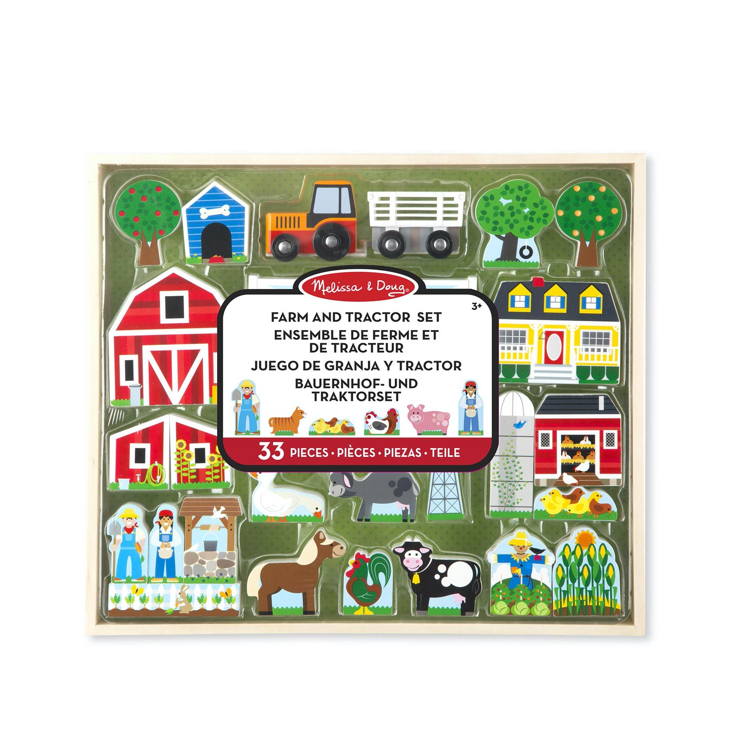 Il set di Melissa & Doug è composto da 33 blocchi in legno sul tema della fattoria. Include un trattore con ruote e un rimorchio a fondo piatto. I pezzi sono decorati con colori atossici e si abbinano al tappeto di attività di Melissa & Doug.