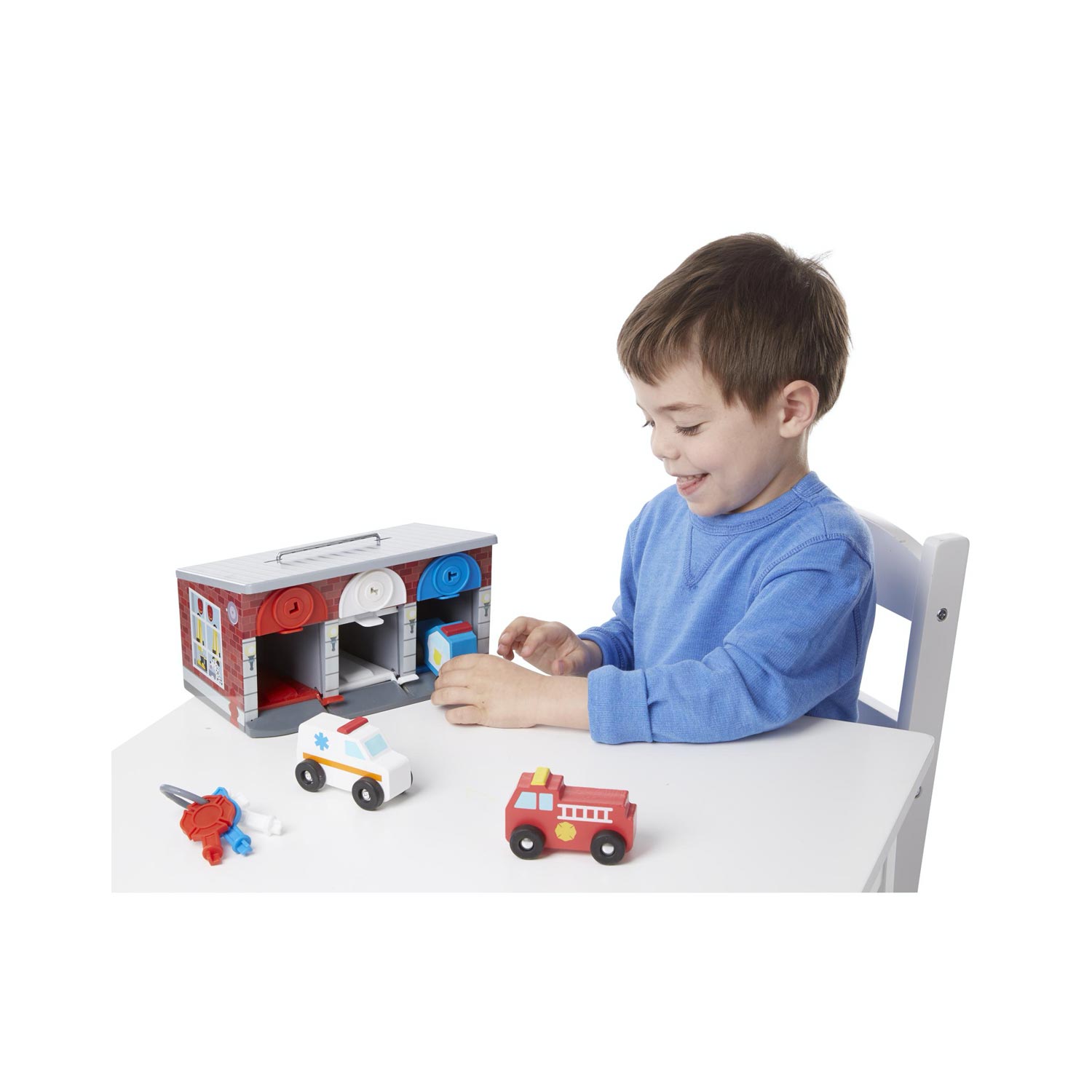 Il garage di Melissa & Doug contiene 3 porte da aprire con le chiavi dello stesso colore. Allinterno 3 mezzi di soccorso da far uscire dalla rampa dopo aver premuto il bottone. Un gioco dinamico per sviluppare la fantasia e la coordinazione.