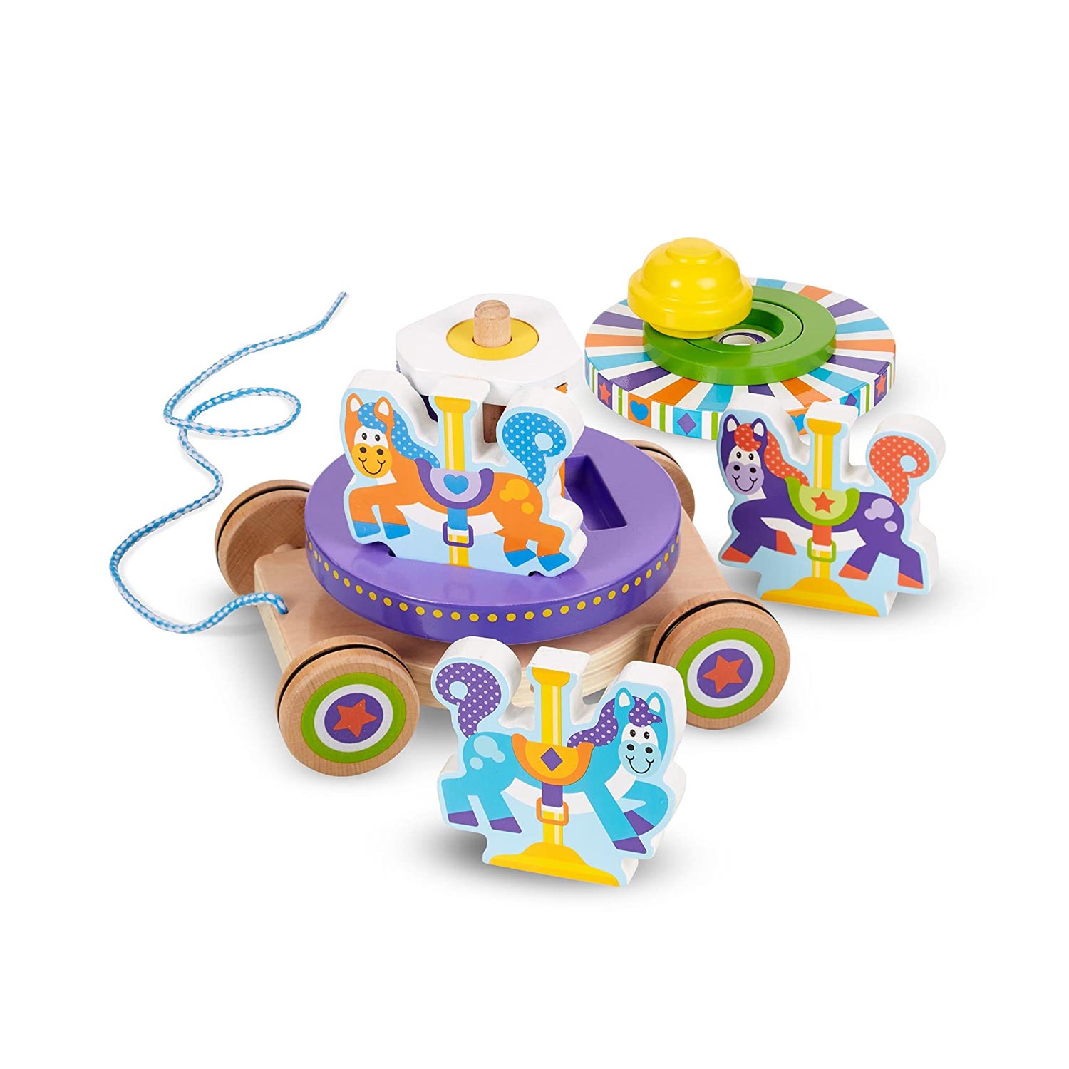 Il carosello che ruota di Melissa & Doug è accompagnato da un carrellino in legno e un laccio da tirare. Un gioco divertente, educativo e dai colori arcobaleno che invoglia i più piccoli a camminare sviluppando le loro capacità motorie. I pezzi sono rimovibili creando più opzioni di gioco.