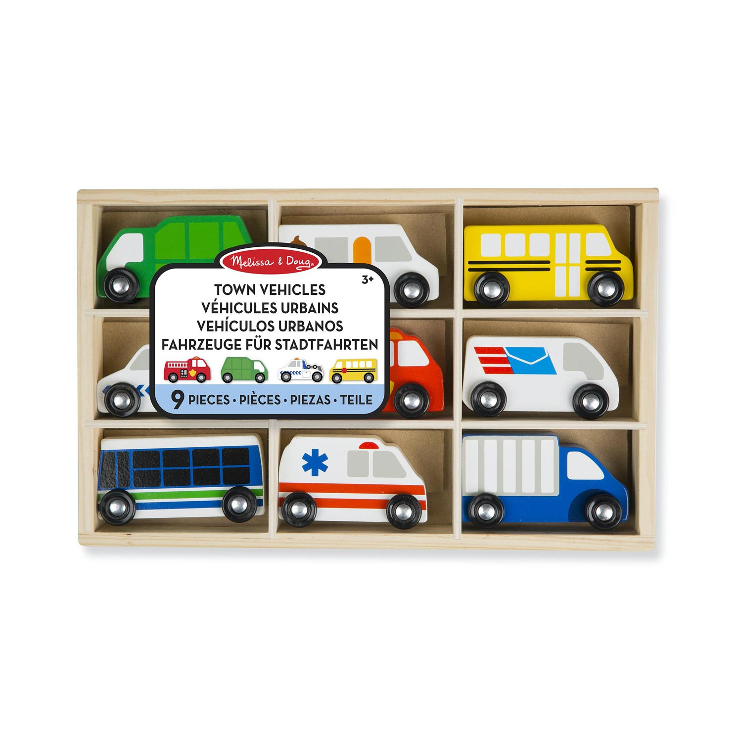 Il set di Melissa & Doug include un camion della spazzatura, un camioncino della posta, un bus scolastico, un carroattrezzi, un camion dei pompieri, un camioncino dei gelati, un autubus, unambulanza ed un furgoncino delle consegne.