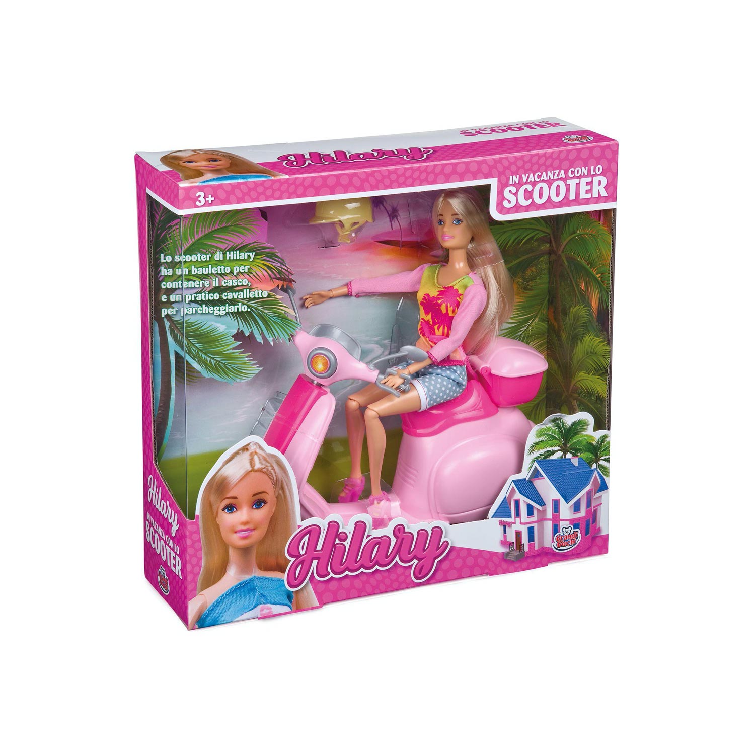 Hilary di Grandi Giochi è in sella al suo scooter rosa fashion per godersi le sue vacanze estive. Indossa uno short e una maglietta realizzati in tessuto e curati nei minimi particolari. Lo scooter è fornito di un casco giallo e un bauletto apribile dove posizionare i suo accessori.