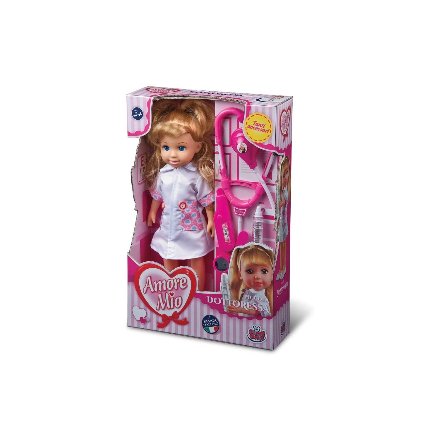 Amore mio Piccola Dottoressa di Grandi Giochi è una bambolina simpatica che ama prendersi cura delle persone. Indossa un camice bianco decorato e porta con sé tantissimi accessori: uno stetoscopio, termometro, siringa e un abbassalingua come una vera dottoressa.