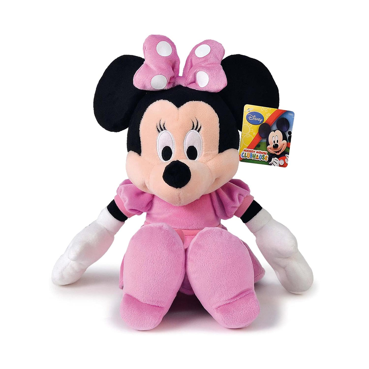 Il peluche di Minnie è alto 33 cm e sfoggia il suo classico look con labito rosa a pois. Indossa un elegante vestito con dettagli ricamati e le classiche scarpette del personaggio.