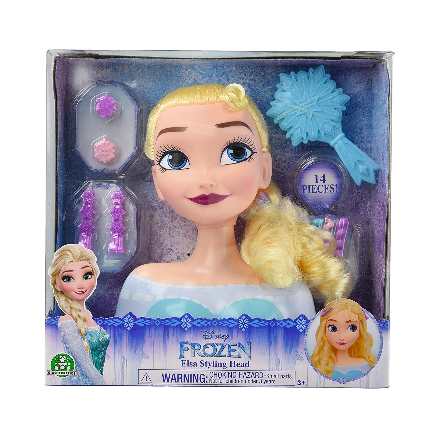 La testa di Frozen di Grandi Giochi permette di creare tantissime opzioni di acconciatura per un giorno delle fiabe o un look da sera incantato. Il set comprende 14 accessori per capelli per rendere ancora più glamour la piega del personaggio Disney.