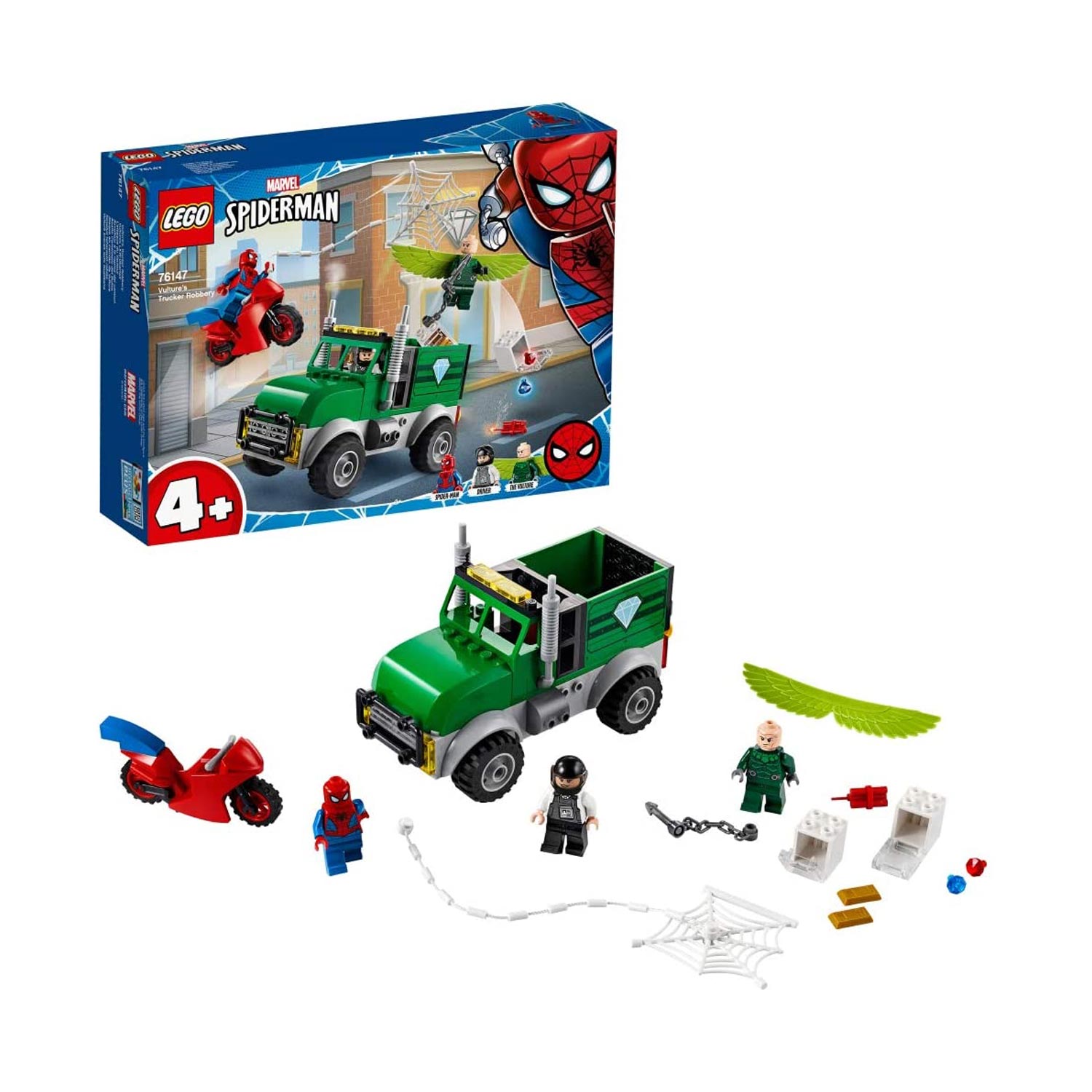Il set Avvoltoio e la rapina del camion di Lego Marvel include le minifigure di Spider-Man, dell’Avvoltoio e del conducente del camion, la moto di Spider-Man, un furgone portavalori con la parte posteriore esplodente e un motore che può essere ricostruito sul cofano.