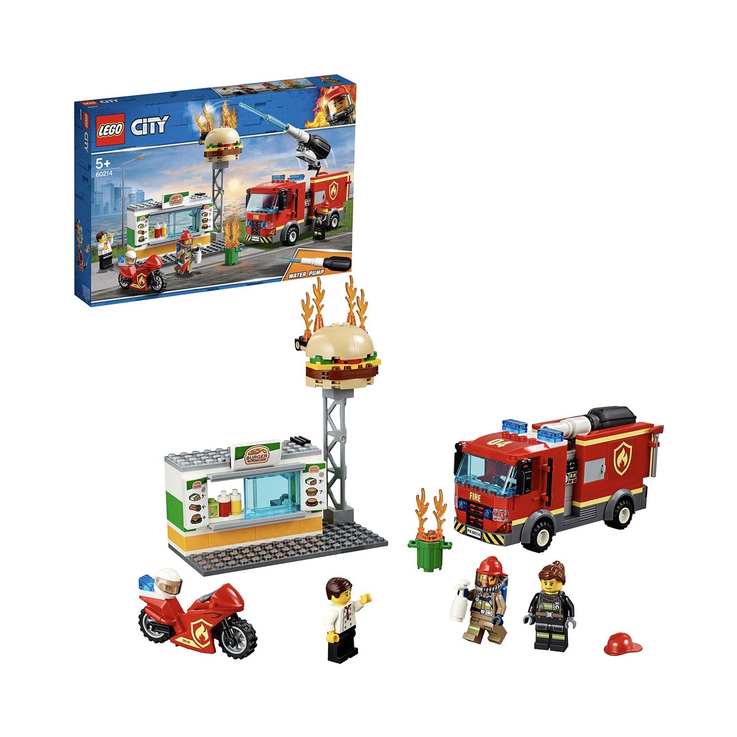 Il set Burger bar in fiamme di Lego City è costituito da uninsegna, elementi fiamma abbattibili, finestra di servizio scorrevole e pattumiera. Contiene anche unautopompa con cabina di guida, 2 compartimenti, retrotreno girevole, cannone direzionale con funzione getto d’acqua, ascia antincendio e una moto con spazio estintore. Nella confezione sono presenti 3 minifigure: 2 pompieri e il cuoco.