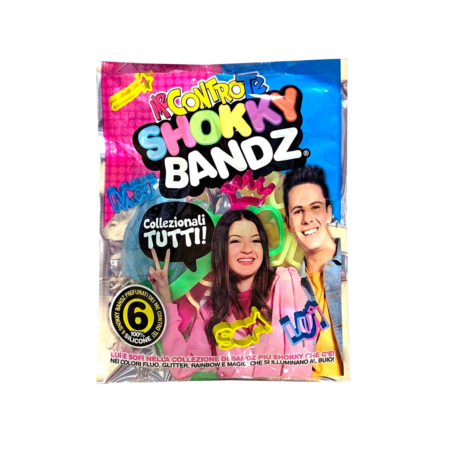 Nella confezione sono presenti 6 Shokky Bands dei Me Contro Te in silicone nei vari colori fluo, glitter, rainbow e magici che si illuminano al buio. La collezione completa è composta da 6 categorie ognuna con 6 simboli.
