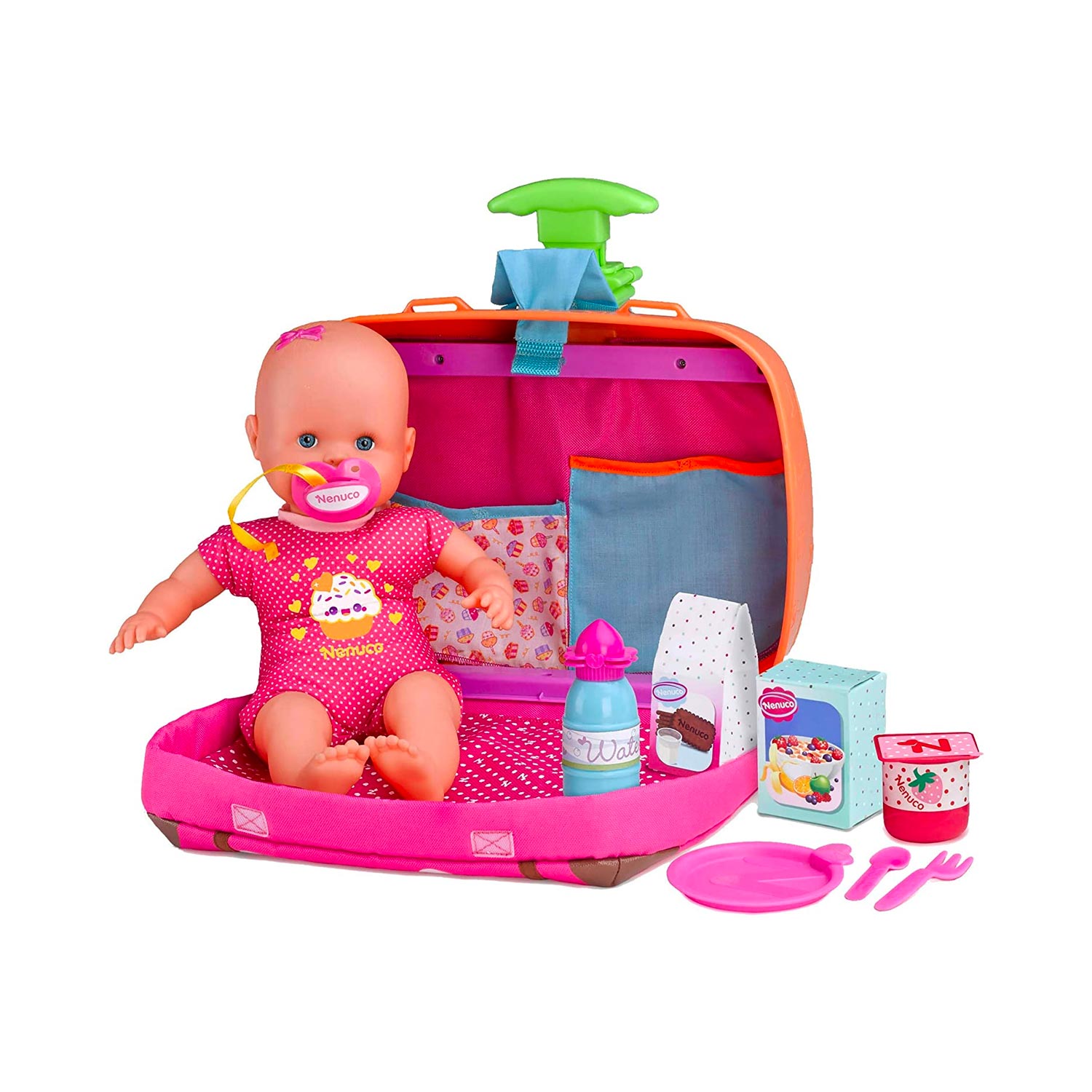 La bambola di Nenuco è perfetta per essere portata sempre con sé grazie alla borsa da viaggio. La bambina potrà mettergle la cintura, regolare la barra e farla giocare e mangiare grazie agli accessori inclusi. É possibile utilizzarlo anche in modalità zainetto e potrà essere fissato alla parte posteriore del seggiolino grazie alle corde incluse.